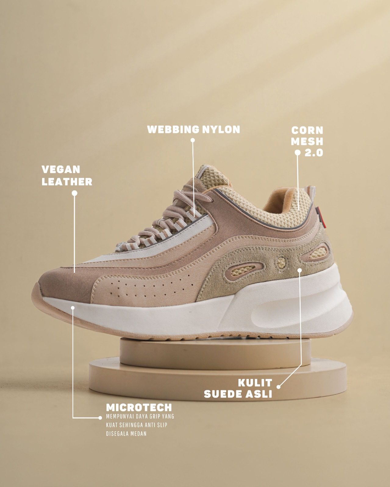Upper : Kulit Suede Asli, Vegan, Microfiber, Reflective, Webbing, Cornmesh 2.0